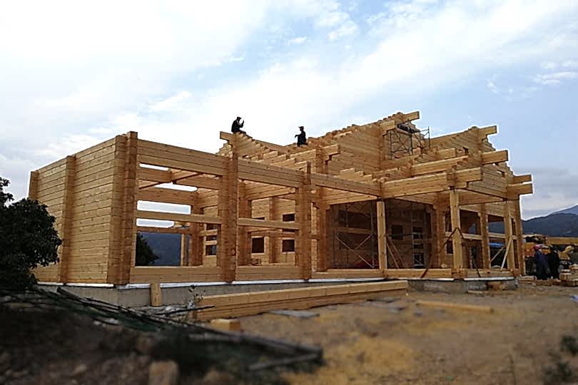 По завершению монтажа венцов 1 этажа производят монтаж балок перекрытия между 1 и 2 этажом (матки), путем врезки на половину венца стены. Далее по ранее Пин Ап схеме происходи сборка 2 этажа.